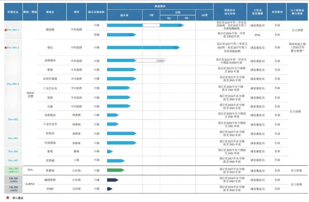 目前,華芢生物既無商業化產品,也無營收、無利潤。公司目前有十條在研管線,涵蓋14個適應症。其中,有兩款核心產品,一款用於治療燒燙傷的Pro-101-1,處於IIb期臨牀試驗階段,另一款用於治療糖尿病足(俗稱“糖足”)的Pro-101-2,處於II期臨牀試驗階段,這兩款都屬於PDGF藥物。