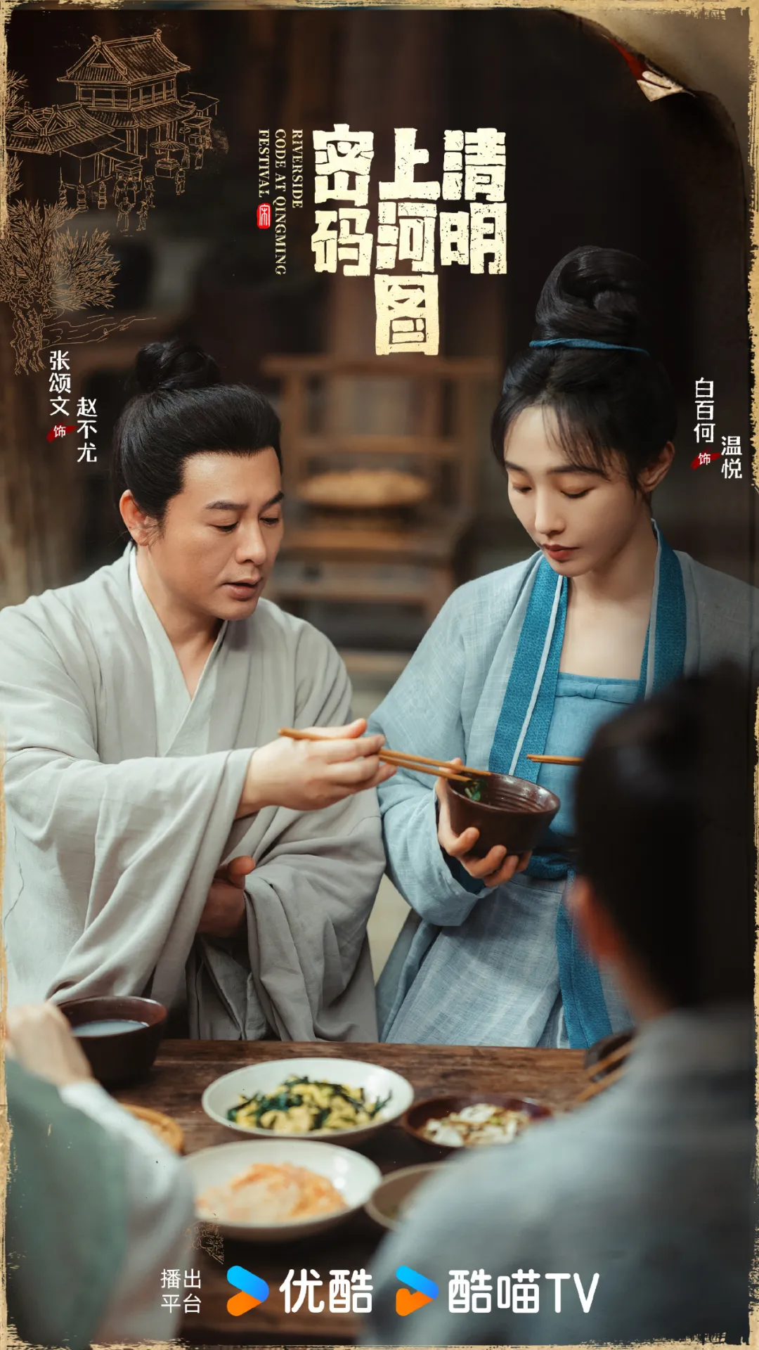 解鎖完了劇中張擇端“北宋天眼”的身份,讓我們再來看看主線劇情。和以往的探案劇不同,《清明上河圖密碼》啓用的是素人探案視角,這一大家子原本沒有“神探”的光環,頭銜最大的趙不尤都只是大理寺一個默默無聞的貼書小吏,妻子温悦則經營着一家傘鋪,全家最大的指望就是可以早點賺錢換大房子,在東京城,他們一家是最平凡普通的煙火日常。