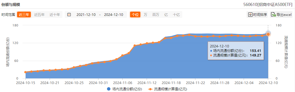 看好A500指數的朋友可以關注一下A500指數ETF(560610)。該ETF作為首批跟蹤中證A500指數的ETF之一,也是滬市首隻百億級的中證A500ETF。目前該ETF規模149.27億,份額153.41億份,雙雙刷新歷史新高,備受投資者青睞。