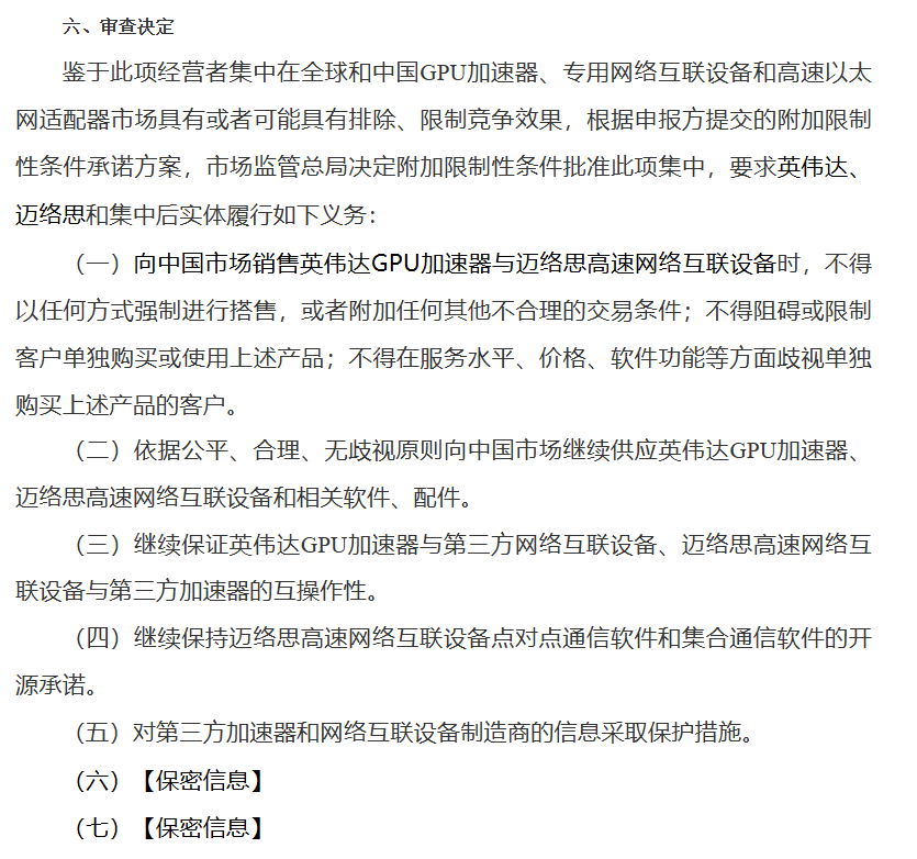 2020 年 4 月 16 日,我國市場監管總局公佈了前文提到的《 市場監管總局關於附加限制性條件批准英偉達公司收購邁絡思科技有限公司股權案反壟斷審查決定的公告 》( 下文稱《 公告 》 ),文件表明了市監局在有附加限制性條件的情況下批准了併購,緊接着在 4 月 27 日,英偉達宣佈完成對邁絡思的收購。
