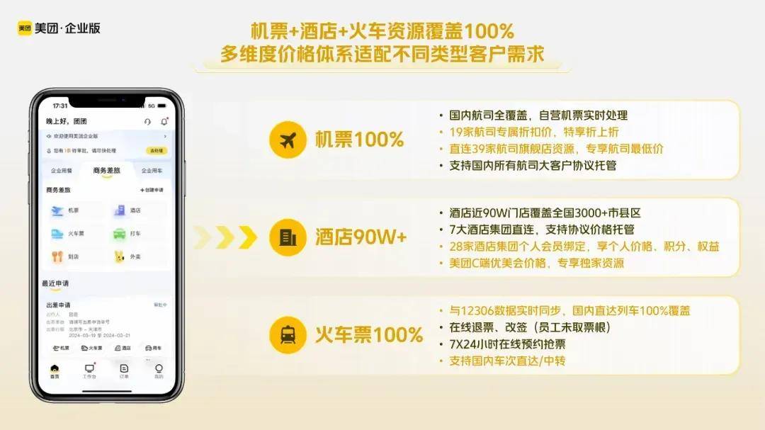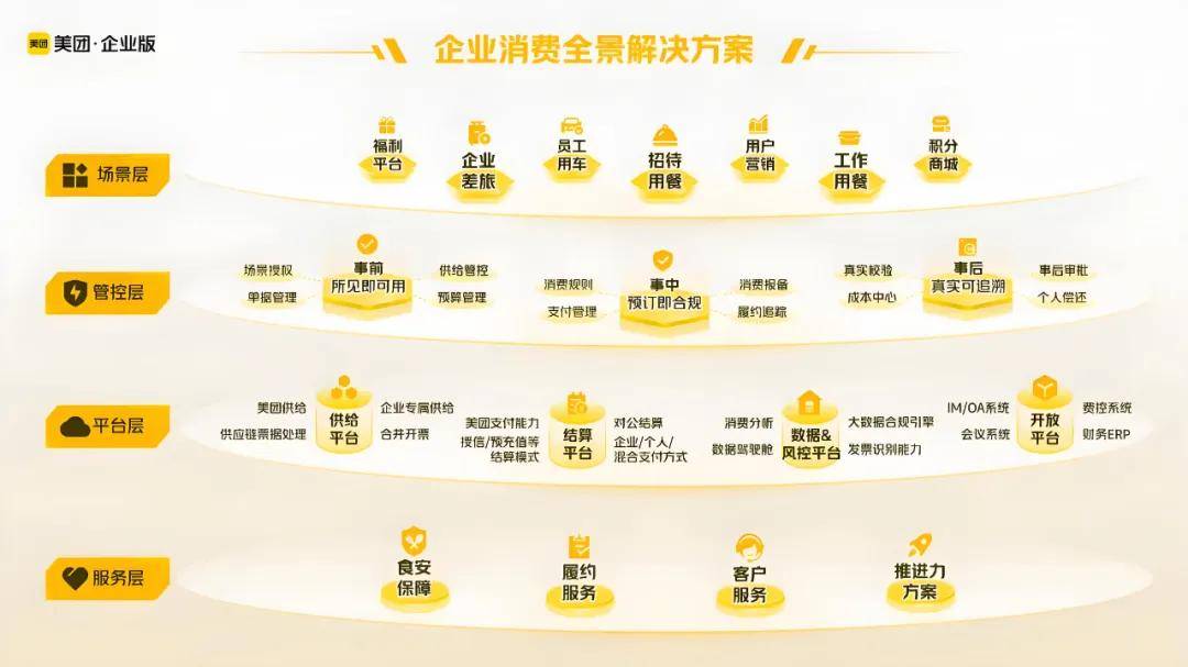 以美團企業版為例,其為企業提供多場景、一站式的解決方案正是對市場需求深刻洞察後的有力回應,通過整合消費、交易至結算的全鏈條,幫助企業實現從消費源頭到結算終端的全面管控,從而有效規避合規風險,提升審批效率,簡化管理流程,為企業的穩健發展奠定堅實基礎。