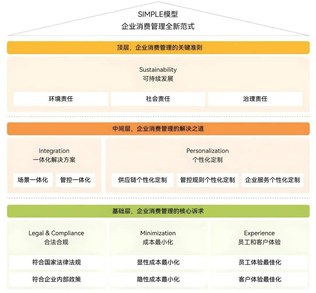 SIMPLE模型是企業消費管理領域的一個創新框架,它從六個關鍵維度出發,構建了一個立體、多層次的管理體系。具體來看,S是Sustainability可持續發展;I是Integration一體化解決方案;M是Minimization成本最小化;P是Personalization個性化定製;L是Legal&Compliance合法合規;E是Experience員工體驗。