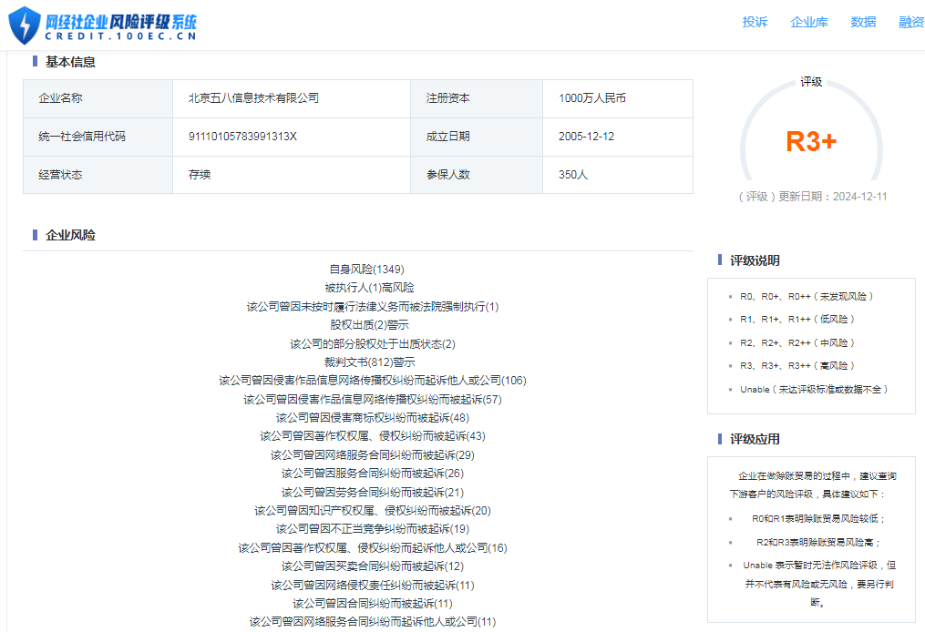 據“網經社企業風險評級系統”顯示,“58同城”所屬北京五八信息技術有限公司的風險評級為R3+,公司目前所處高風險。
