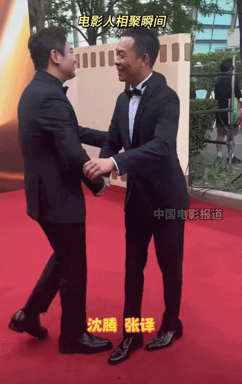 沈騰遇到同輩的張譯,友好擁抱,遇到葛大爺後,立馬半蹲彎腰握手,絲滑連貫。