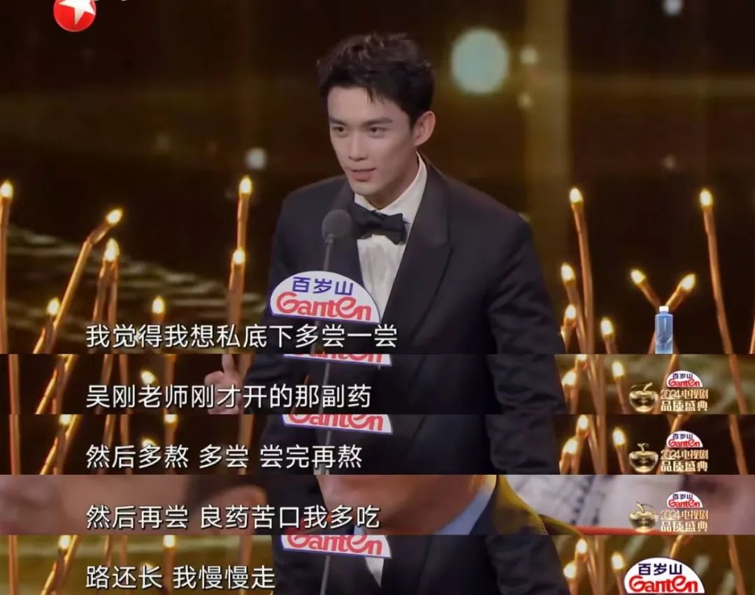 主持人讓他分享,他故作高深隱喻自己演戲是小火慢熬,有料,又自顧自地給了台下的晚輩指導建議,言下之意向我看齊。