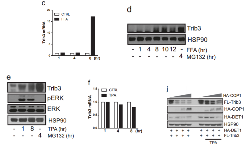 具體來説,FFA能增加前棕色脂肪細胞(能分化成棕色脂肪細胞)中Trib3的mRNA和蛋白水平;DAG模擬物質TPA能通過直接激活PKC酶的方式增加Trib3蛋白數量,且能同時抑制Trib3降解蛋白COP1的降解作用。促表達的同時抑制降解,高脂飲食下Trib3的表達想不被增加都難!