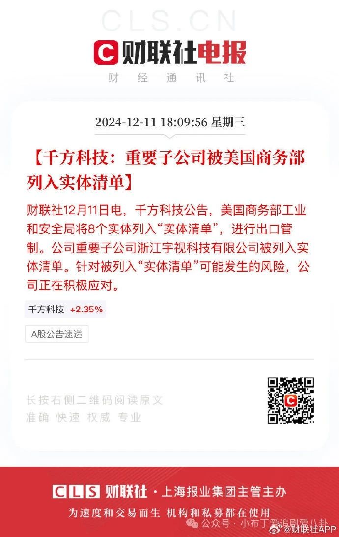 財聯社12月11號的報道,浙江宇視科技有限公司被美國商務部和國安局列為實體清單,實施出口管制。