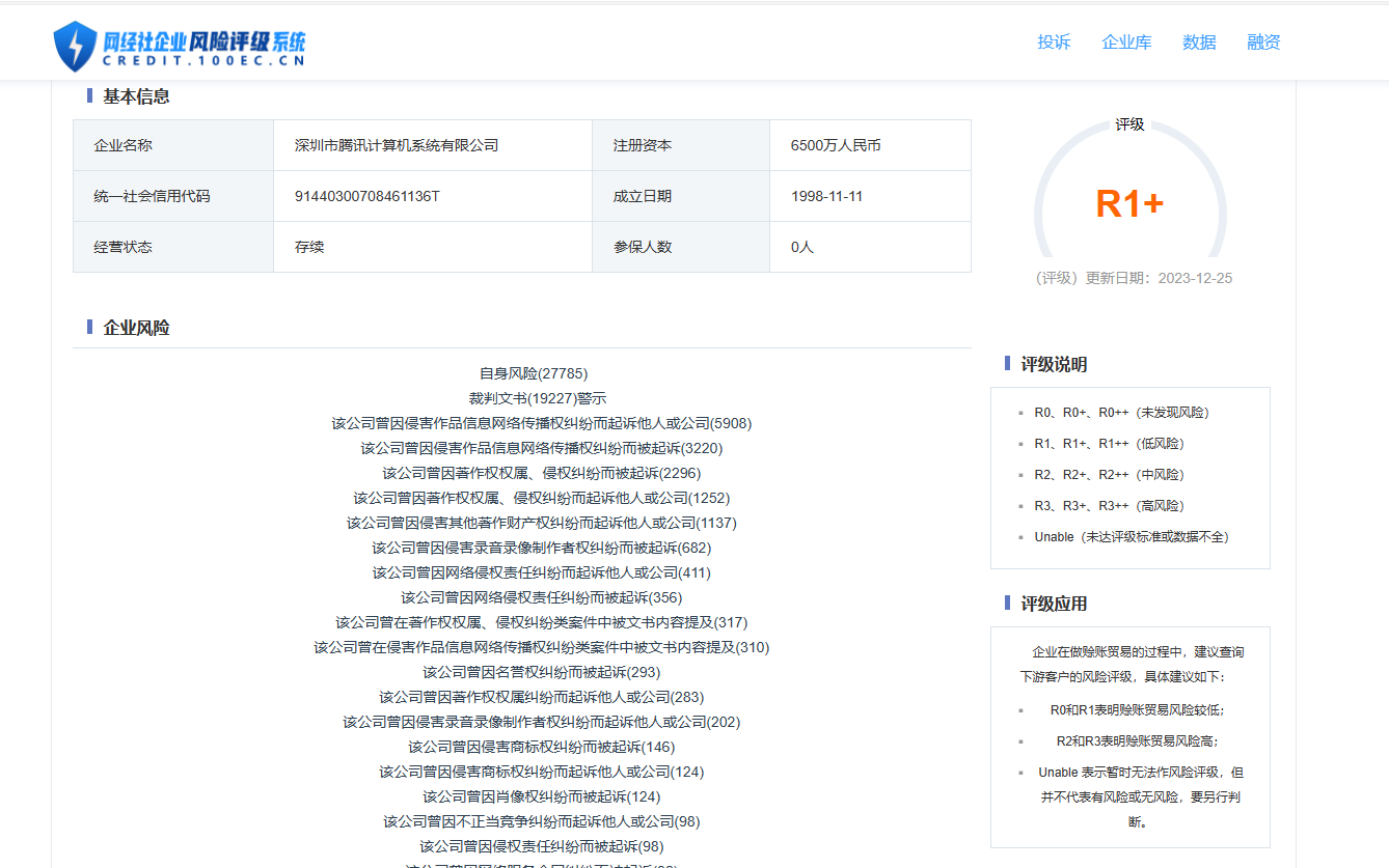 據“網經社企業風險評級系統”顯示,微信視頻號隸屬的深圳市騰訊計算機系統有限公司風險評級為R1+,公司目前所處低風險。
