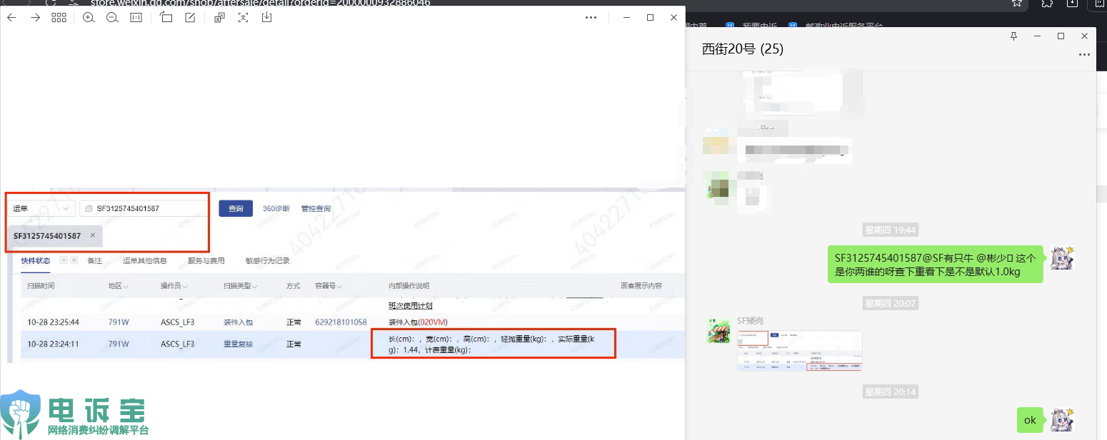 鄧先生還稱,無獨有偶,該買家在店鋪購買的另一個訂單:3723262702966146560的退貨單號也是SF3125745401587,該物流單號是10月28日寄出10月30日收到,商家在核對物流發貨以及買家退貨的重量,發現買家收到發貨商品的重量為:2.63kg,但買家退貨物流的重量為:1.44kg,可以得出買家寄回只有一件衣服。而目前平台判罰導致商家錢貨兩失。