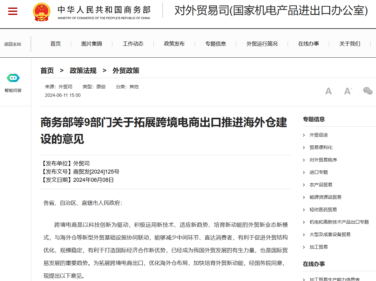 6月11日,商務部等9部門發佈《關於拓展跨境電商出口推進海外倉建設的意見》。《意見》包括積極培育跨境電商經營主體、加大金融支持力度、加強相關基礎設施和物流體系建設、優化監管與服務、積極開展標準規則建設與國際合作等5方面,拓展跨境電商出口,優化海外倉佈局,加快培育外貿新動能。