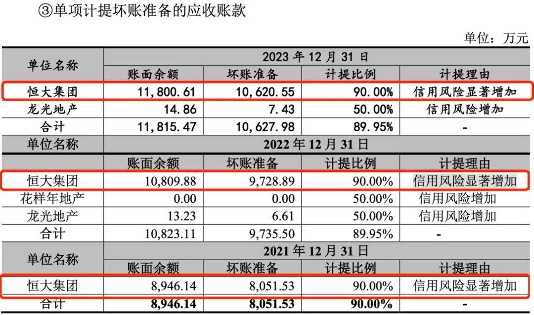 報告期內,宏業基對恒大集團計提的應收賬款壞賬準備分別為8051.53萬元、9728.89萬元和1.06億元,壞賬計提比例均為90%。