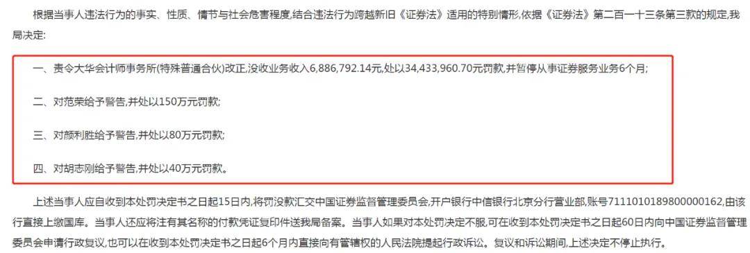 今年5月14日,江蘇證監局披露對大華所的行政處罰決定書。因大華所在對上市企業金通靈科技集團股份有限公司提供財務報表審計中,未勤勉盡責,所出具的審計報告存在虛假記載等違規事宜被責令改正,沒收大華所業務收入688.68萬元,處以3714.4萬元罰款,並暫停從事證券服務業務6個月。