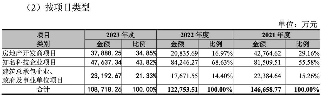 按項目類型分,報告期內,宏業基來自知名科技企業項目的營業收入比例在五成左右,房地產開發商項目則在兩到三成。