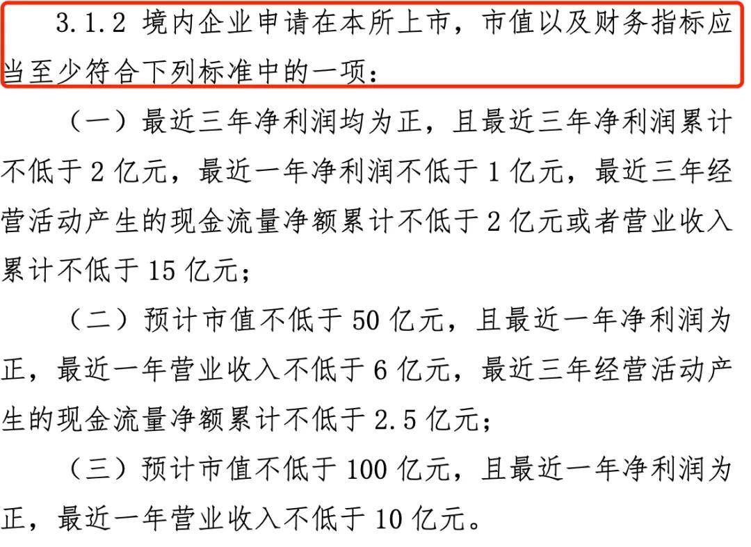 值得一提的是,今年4月,深交所將上市財務標準進行了修訂,要求申請上市企業需要至少滿足三項標準中的一項,包括最近一年淨利潤不低於1億元、最近三年經營活動現金流淨額累計不低於2.5億元以及預計市值不低於100億元等。