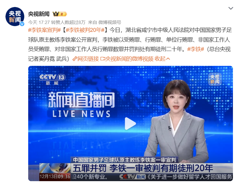 2024年12月13日,湖北省咸寧市中級人民法院,對中國國家男子足球隊原主教練李鐵案公開宣判:“李鐵被以受賄罪、行賄罪、單位行賄罪、非國家工作人員受賄罪、對非國家工作人員行賄罪數罪併罰判處有期徒刑20年”。