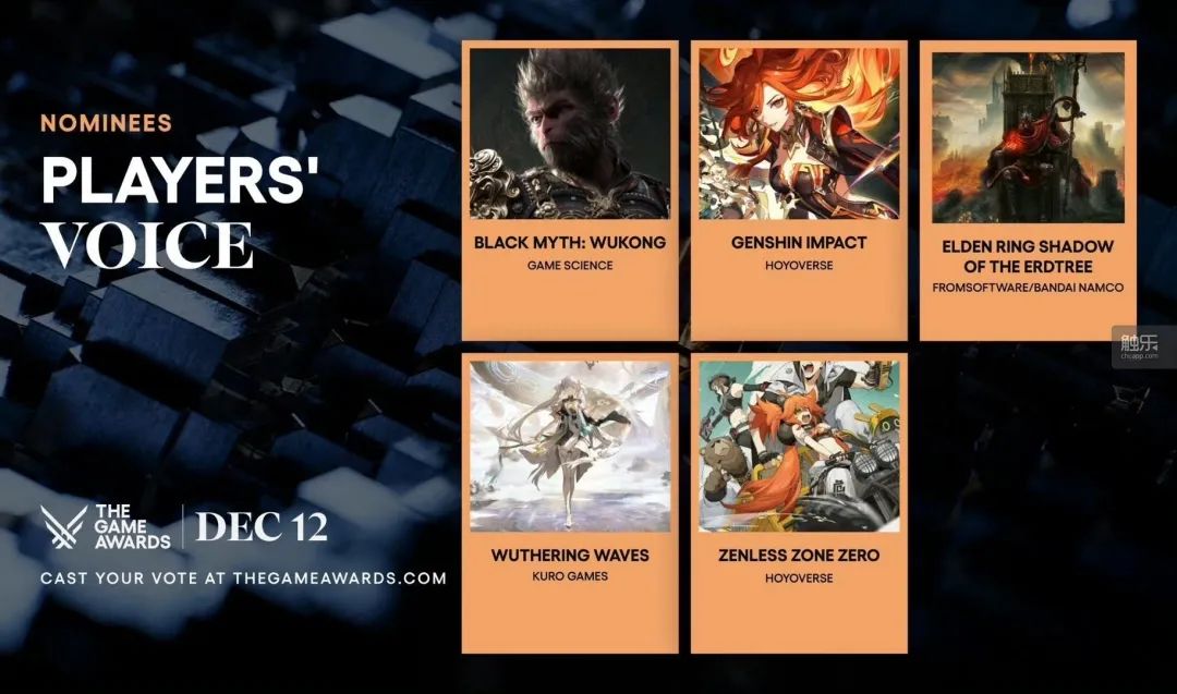 2024年TGA“玩家之聲”進入最終投票的5款入圍遊戲,其中4款是中國遊戲