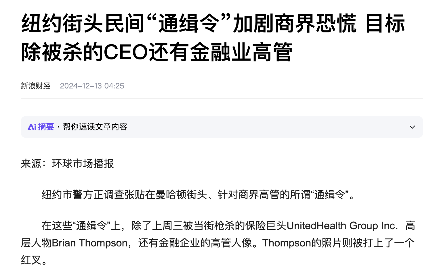這兩天還有一個新聞引起公眾關注,就是美國最大的健康保險公司“聯合健康保險公司”的總經理在美國紐約市遭槍擊身亡的事情。