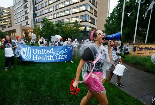 | 2024年7月,人們在位於美國明尼蘇達州的聯合健康保險公司外抗議。