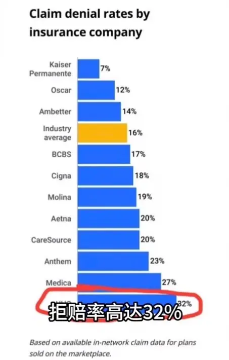 聯合健康保險公司拒付率是行業裏最高的,達到了令人難以置信的32%!