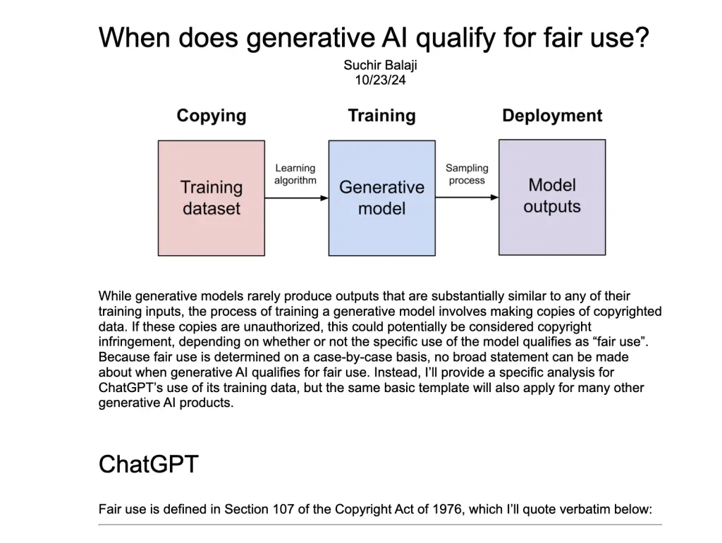 巴拉吉10月發佈的《生成式人工智能何時才符合合理使用條件?》文章截圖