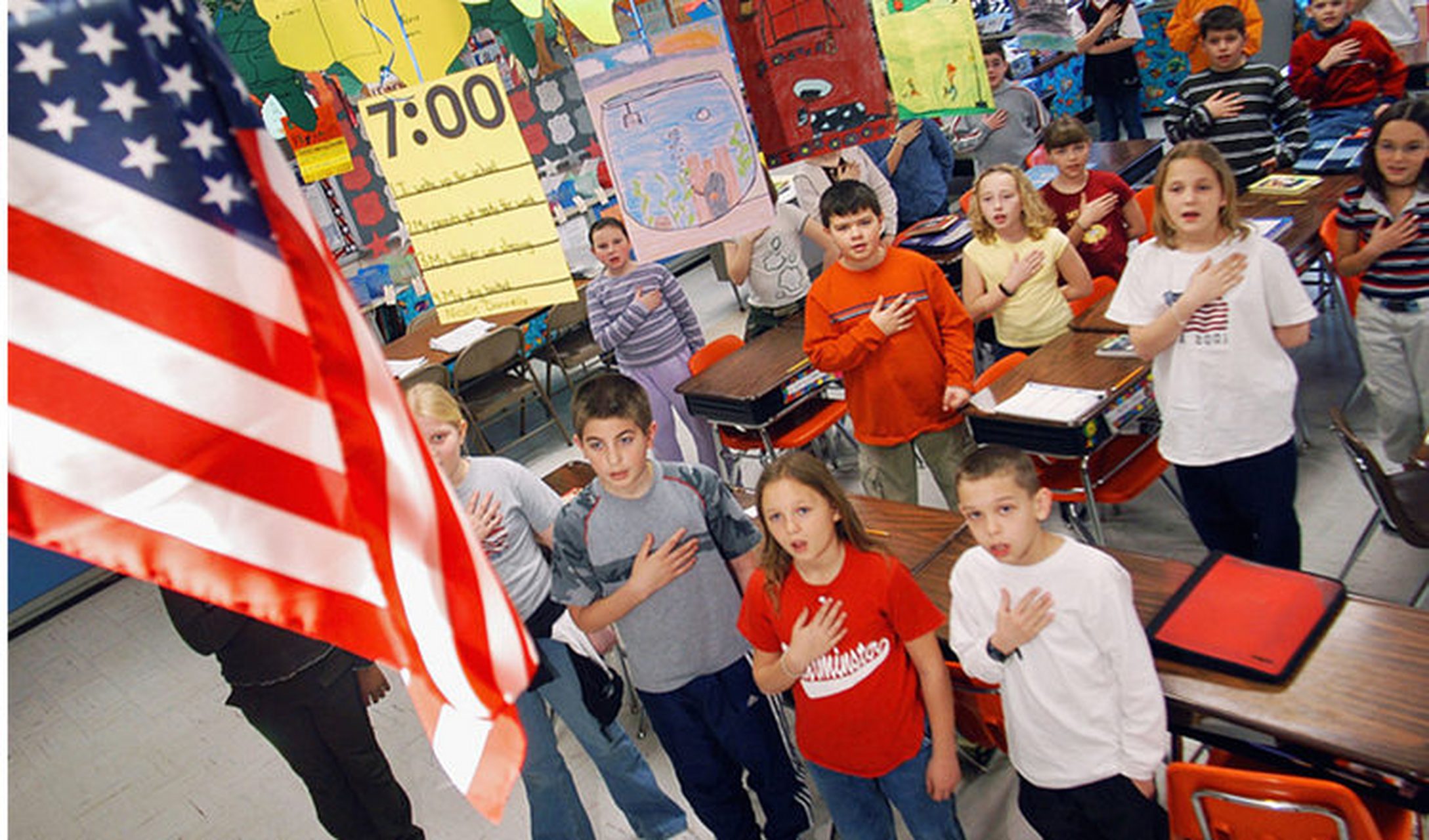 美國50個州里的47個州,全美98%的縣,超過99%的學區都強制規定,只要是教學日,上課前的第一個環節必須為學生全體起立背誦"效忠宣誓"詞,但是不需要升國旗,因為每個教室裏的國旗壓根不會降下來。