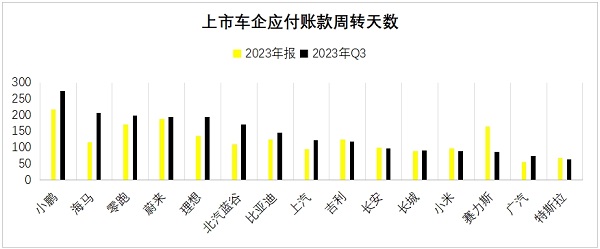 具體而言,小鵬汽車的應付賬款週期天數最長,2023年為217天,2024年三季度繼續拉長到274天;其次為海馬汽車,2024年三季度為206天;零跑汽車、蔚來汽車、理想汽車,也接近200天。
