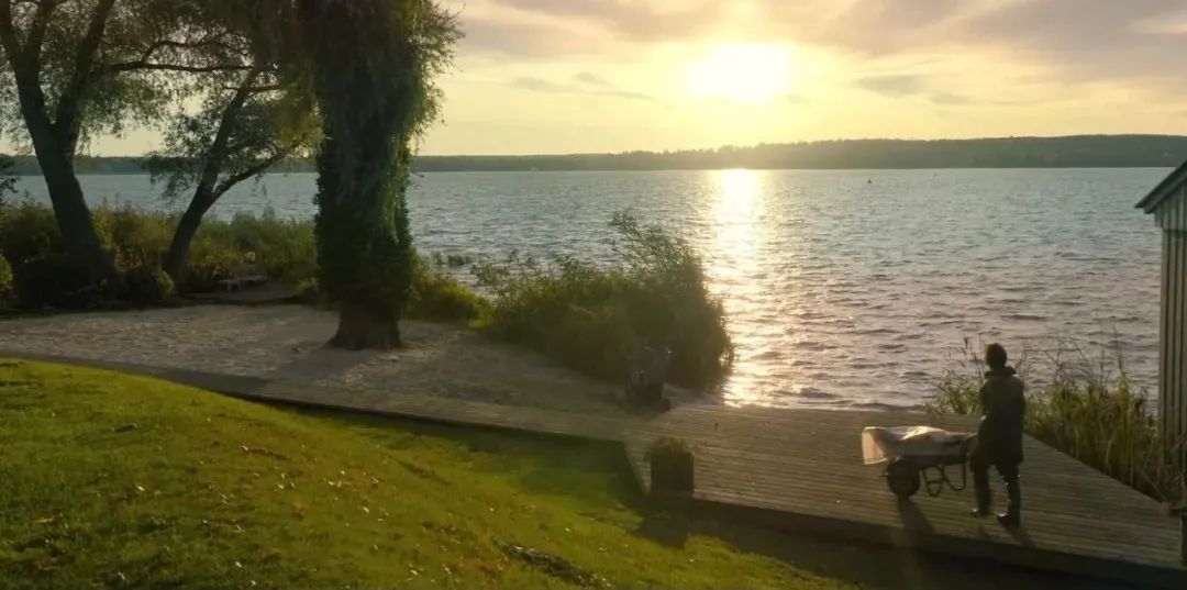 一個平靜美麗的湖濱別墅,男人推着小推車在棧道上走。