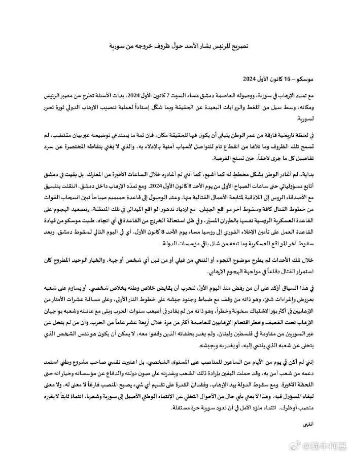 我從來不是一個在個人層面上尋求職位的人,相反,我認為自己是一個國家項目的所有者,該項目得到了相信它的人民的支持。直到最後一刻,我都堅信人民的意志和他們保衞國家、捍衞國家制度和選擇的能力。隨着國家落入恐怖主義之手,失去提供任何東西的能力,這一立場變得空洞而毫無意義,繼續承擔責任也毫無意義。這並不意味着放棄對敍利亞及其人民的真正民族歸屬感,這種固定的歸屬感不會因立場或情況而改變,這種歸屬感充滿了對敍利亞將重新獲得自由和獨立的希望。’