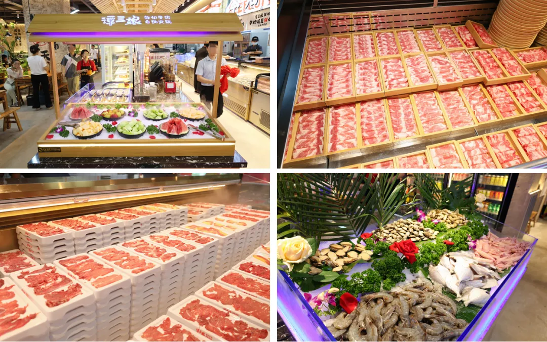 譚三孃的鮮切牛肉食材採自雲貴川上等小黃牛,包括吊龍、匙柄、胸口油等多款鮮切牛肉產品,以及懸掛的整塊鮮牛肉。此外,門店還提供炸物、滷味、燒烤、甜飲品、鮮果等100多個SKU。