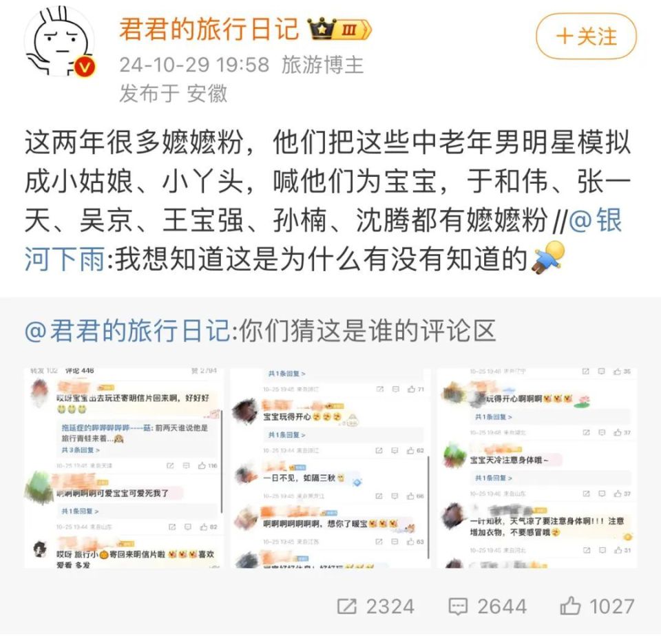 與此同時,有粉絲認為“一旦開始媚嬤嬤,那這個男藝人就完了”“男人只有嬤而不自知時才是最好嬤的”。於和偉那條“配合宣傳”的微博,引發了豆瓣裏#於和偉 自嬤#的話題詞條,不少網友覺得這是在主動“媚嬤”,用一串句號以示心情。