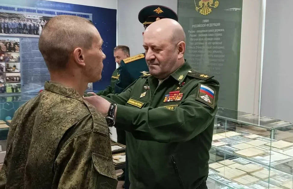 **·**基裏洛夫向一名俄軍士兵授勳。