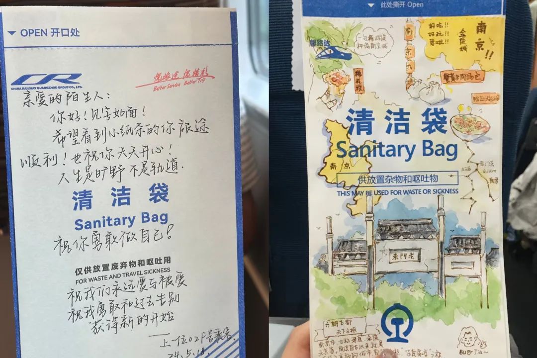 甚至高鐵的清潔袋,都被遊客自發改造成“旅途上的浪漫禮物”。