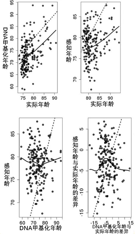 圖注:感知年齡、DNA甲基化年齡和實際年齡都高度相關,但互不干擾[3]