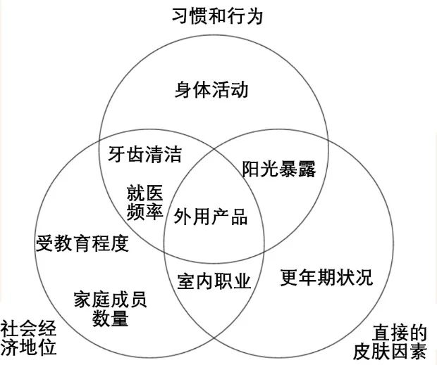 面部每天直面風吹日曬和生活質量,感知年齡自然少不了受到環境因素的影響。習慣行為、社會經濟地位和直接皮膚因素正是影響感知年齡的三大環境因素合集。