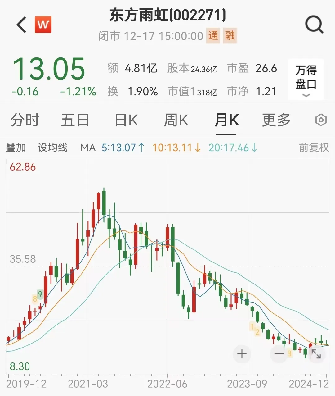 現在的東方雨虹股價只有13元左右,比2021年高峯期跌了70%以上。