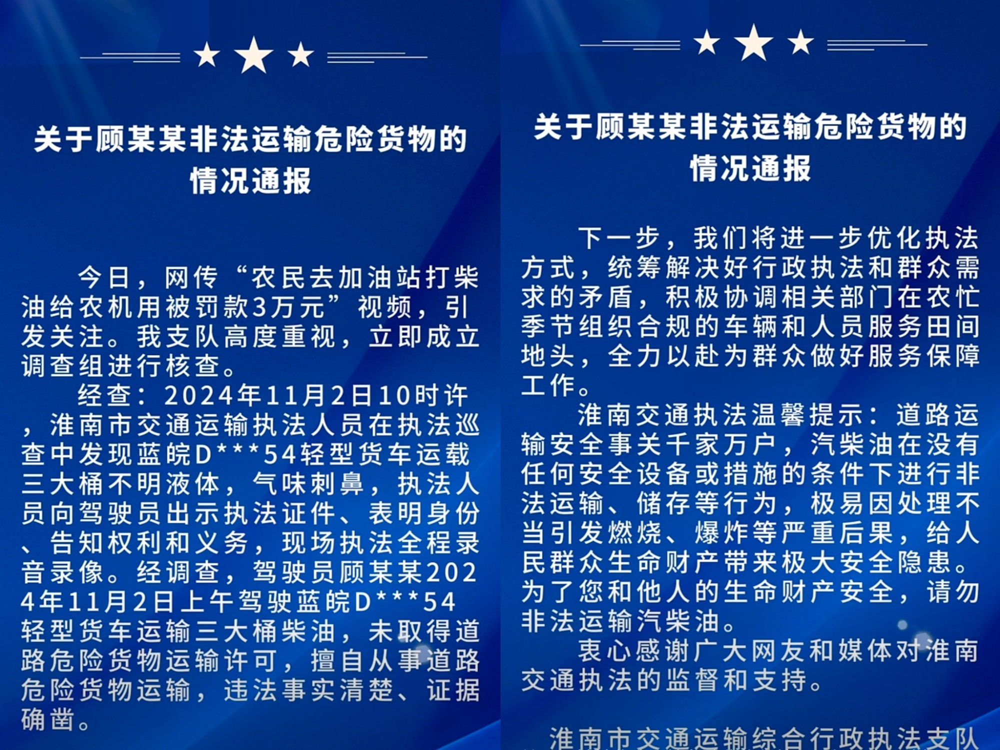 12月13日,淮南交通執法官方賬號發佈通報稱:本案“違法事實清楚”,本機關按法律規定最低限額作出處罰。