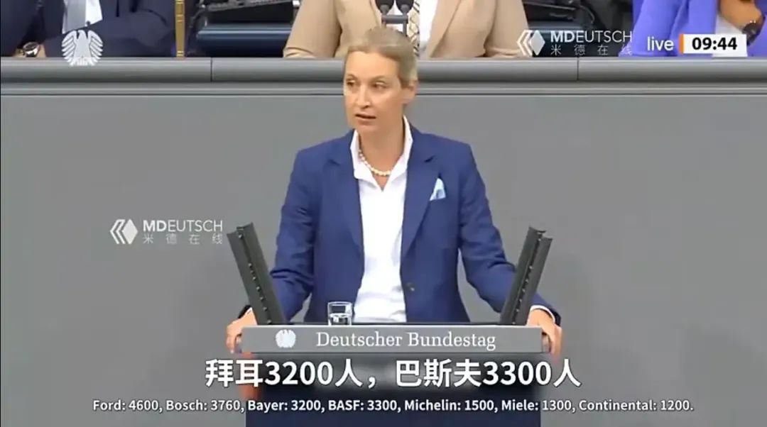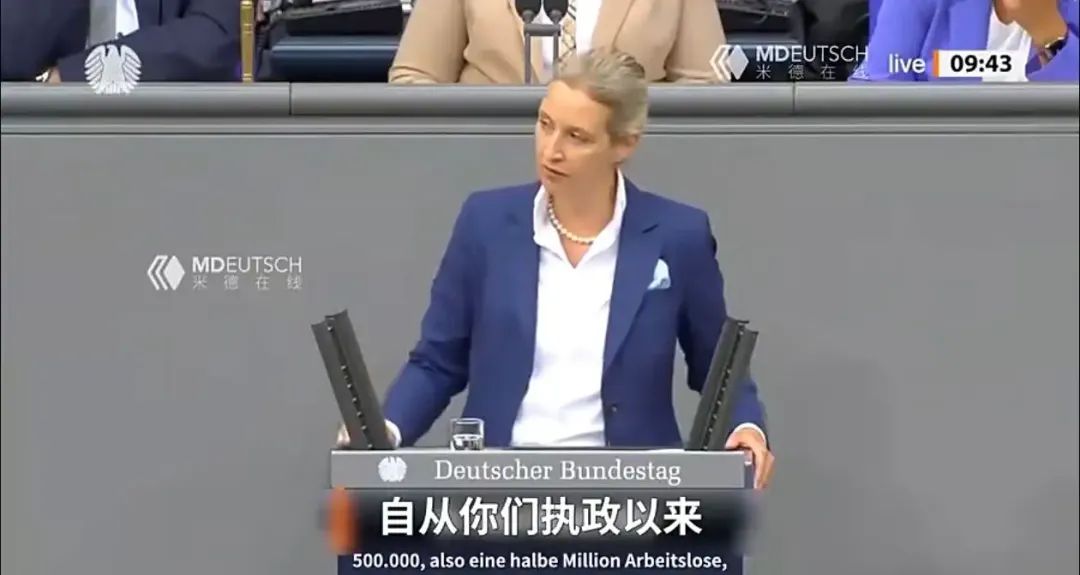 德國選擇黨黨首魏德爾女士嘲諷道:德國總理舒爾茨在不到兩年的時間裏,幫助美國"幹掉"了德國的製造業。