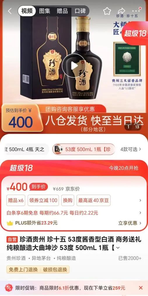 目前,在某電商平台可以發現,珍酒核心單品53度500ml的“珍十五”的優惠前價格為659元,到手價400元,直接打六折。這種情況下,經銷商的利潤將變得非常微薄,自然會影響積極性。
