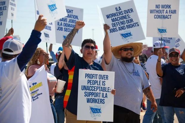 ▲10月1日,美國東海岸和墨西哥灣沿岸30多個碼頭的數萬名工人舉行罷工,要求漲薪,反對港口機械設備自動化。