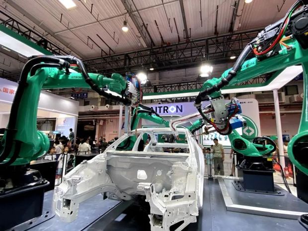▲8月24日,在2024世界機器人大會展廳內,中國製造的六軸機器人伸展鋼鐵手臂,為觀眾現場展示汽車自動化焊接技術。