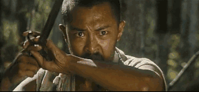 在看到母親被日本新兵當作靶子刺死時,他的怒吼,注意眼部的動作,眼眶快要裂開,正如野獸。