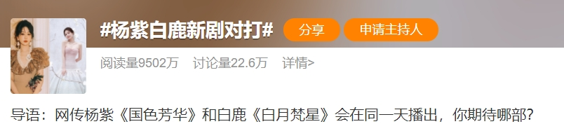 剛説完對打的好處,這不營銷就來了:網傳楊紫和白鹿新劇會在同一天開播。