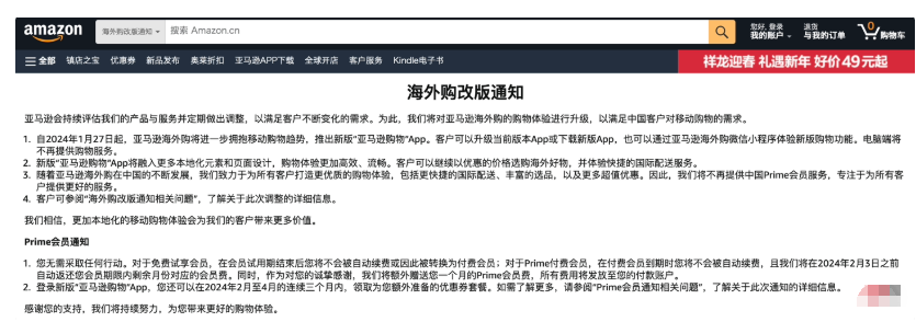 1月2日,亞馬遜中國近日發佈《Prime 會員通知》《海外購改版通知》,宣佈對 Prime 會員及海外購服務進行調整。自2024年1月27日起推出新版“亞馬遜購物”App,電腦端將不再提供購物服務。