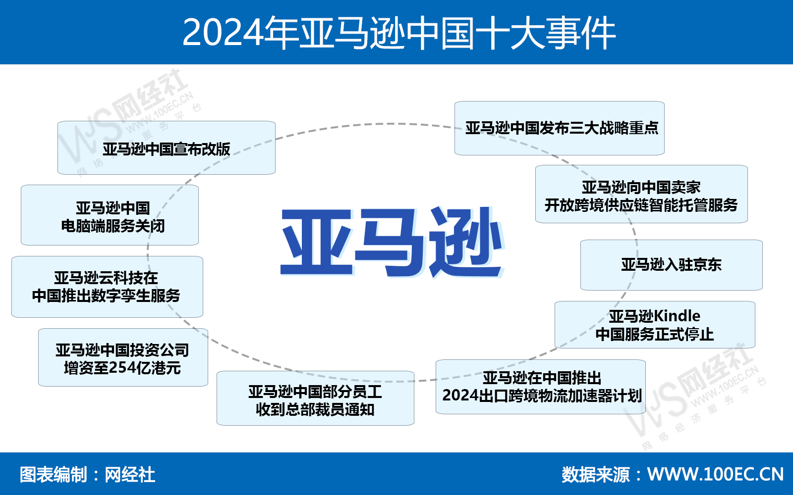 2024年,亞馬遜中國風波不斷。電腦端服務關閉、部分員工收到總部裁員通知、Kindle中國服務正式停止等。與此同時,亞馬遜也頻頻大動作,投資公司增資至254億港元、推出2024出口跨境物流加速器計劃等。以下是“一帶一路TOP10影響力社會智庫”“中國跨境電商50人論壇”副秘書長單位——網經社跨境電商台對2024上半年亞馬遜十大事件進行盤點。