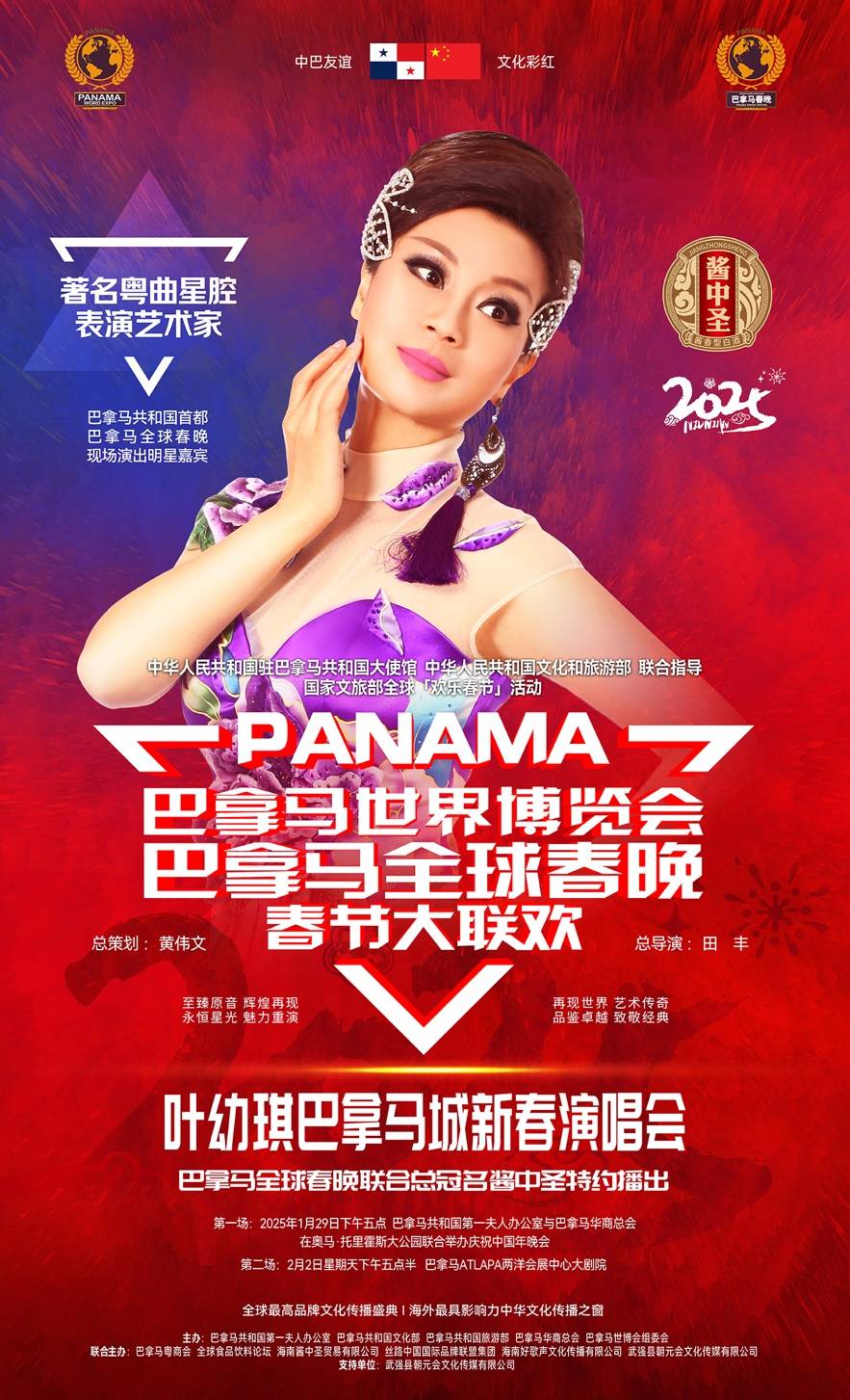 中巴友誼·文化彩虹,受巴拿馬共和國·巴拿馬春晚組委會和巴拿馬華商總會共同邀請,著名粵曲星腔藝術第四代傳人,中國文聯第十一次全國代表大會代表、中國曲協粵曲藝術委員會委員、中國曲協香港會員分會名譽主席-葉幼琪,將遠赴中美洲,參加巴拿馬共和國“中國年”國家節慶日歡樂盛典-海外最具影響力“中華情”春節聯歡活動「巴拿馬春晚」春節大聯歡,葉幼琪將在巴拿馬城舉辦2場專場演出。
