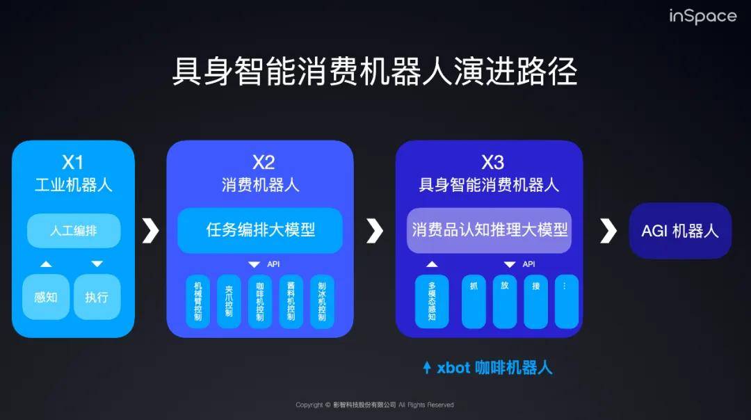 X2階段是消費機器人,結合人工與AI進行任務編排,比如學習咖啡師的技藝訓練機器人的拉花技巧;