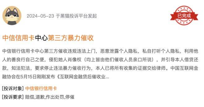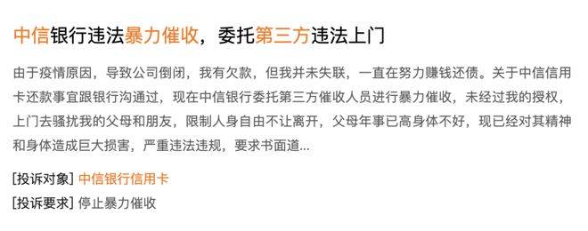 在黑貓投訴中搜索中信信用卡,催收佔了很大一個比例。催收中,使用第三方暴力催收又格外刺眼。不少消費者直言, “ 第三方催收違規上門,惡意泄漏個人隱私……上門騷擾我的父母和朋友,限制人身自由不讓離開,對年事已高的父母精神與身體造成巨大損害…….”