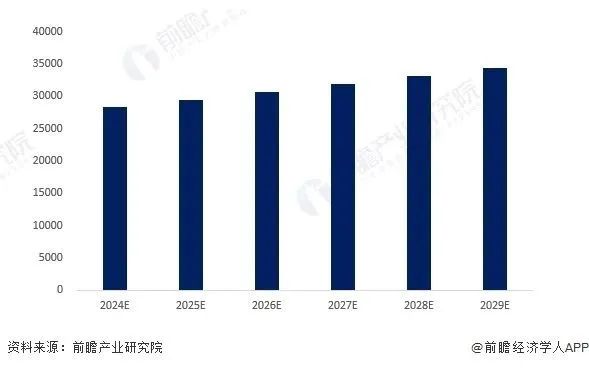 2024-2029年中國紡織業市場規模預測(單位:億元)