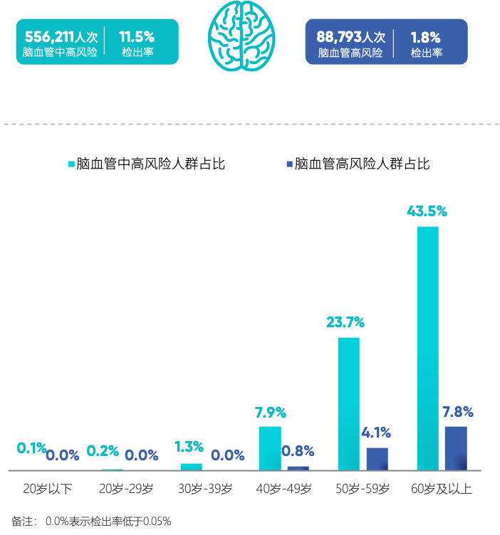 《藍皮書》數據表明,人工智能預測的心腦血管風險隨年齡增大而增加,在40歲時出現跳躍性增長,提示心血管和腦血管風險發生顯著改變,建議40歲及以上人羣每一年至少進行一次健康檢查,以便能夠及時發現心腦血管的健康隱患。