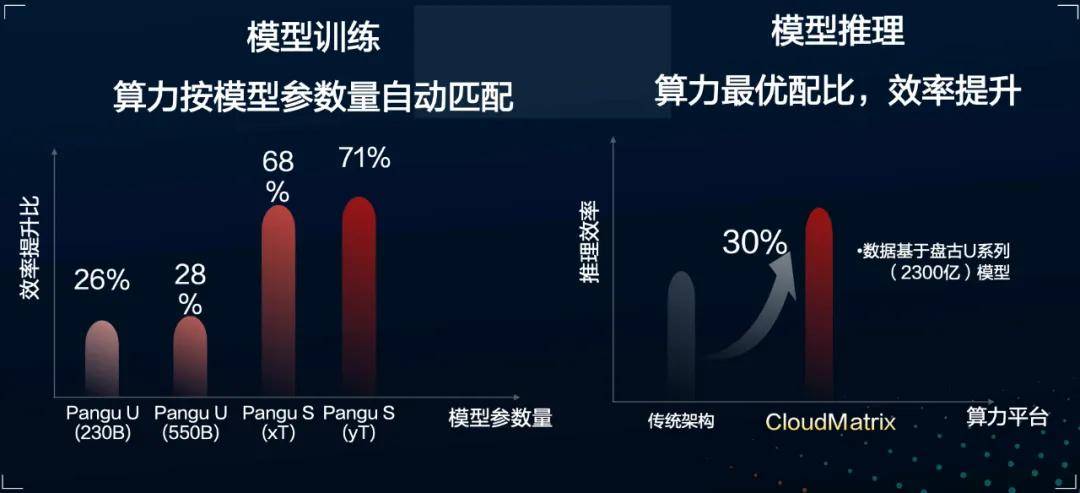 張宇昕舉了一個真實的例子:在使用萬億參數的盤古S模型運行訓練任務時,採用多元算力對等架構的華為雲CloudMatrix,計算效率比傳統架構提升了68%;千億參數的盤古U模型的推理效率提升了30%。